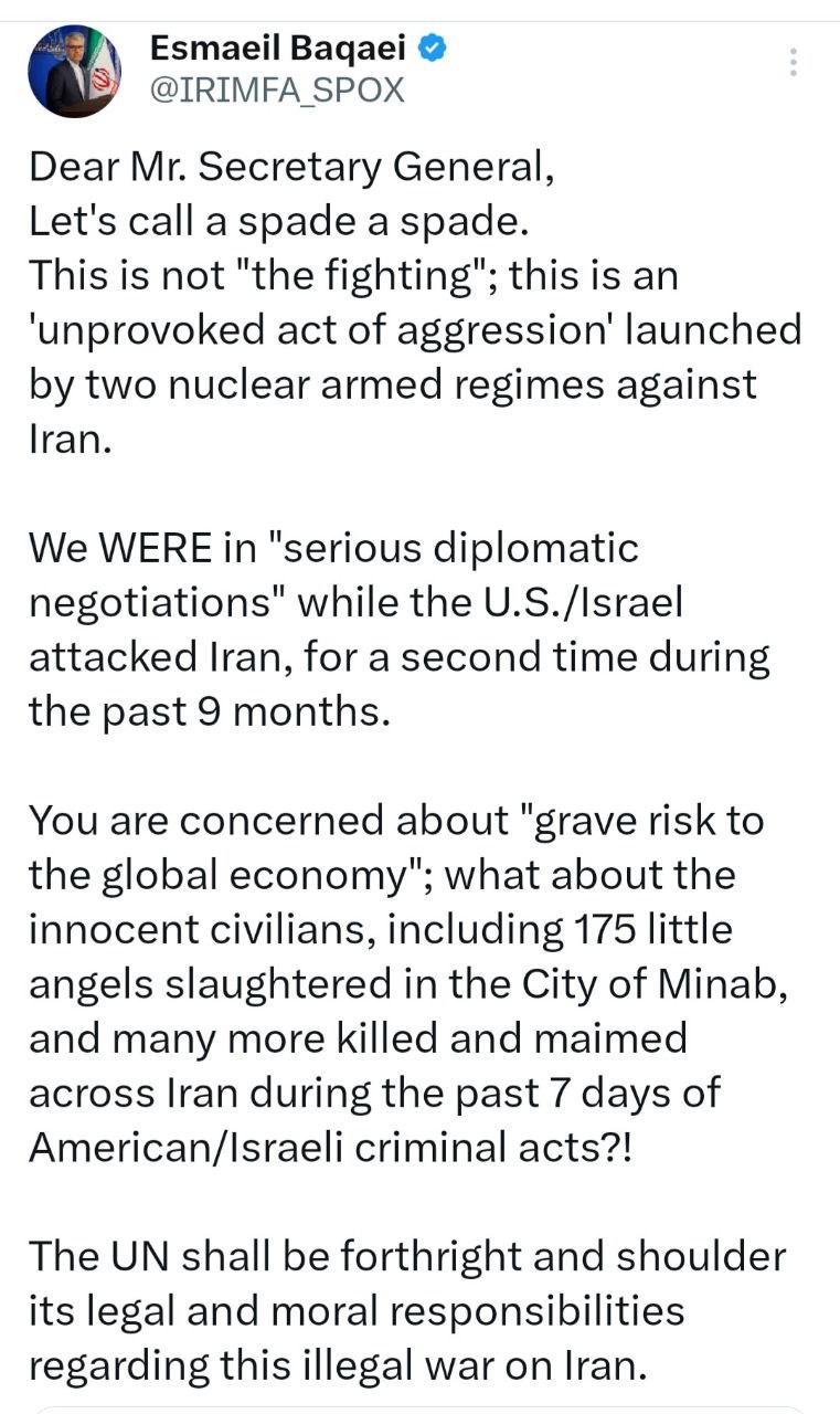 You are concerned about "grave risk to the global economy"; what about the innocent civilians, including 175 little angels slaughtered in the City of Minab, and many more killed and maimed across Iran during the past 7 days of American/Israeli criminal acts?!