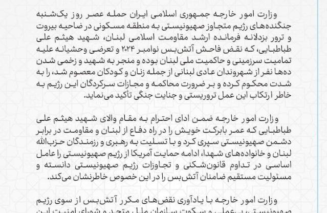 While paying tribute to the lofty status of martyr Tabatabaei, who devoted his blessed life to defending Lebanon and resisting the Zionist enemy, and offering condolences to the leadership and fighters of Lebanon’s Hezbollah and to the families of the martyrs, the foreign ministry considers continued US support for the Zionist regime to be the fundamental factor behind its persistent lawlessness and aggressions, and reminds the direct responsibility of the ceasefire guarantors in this regard.