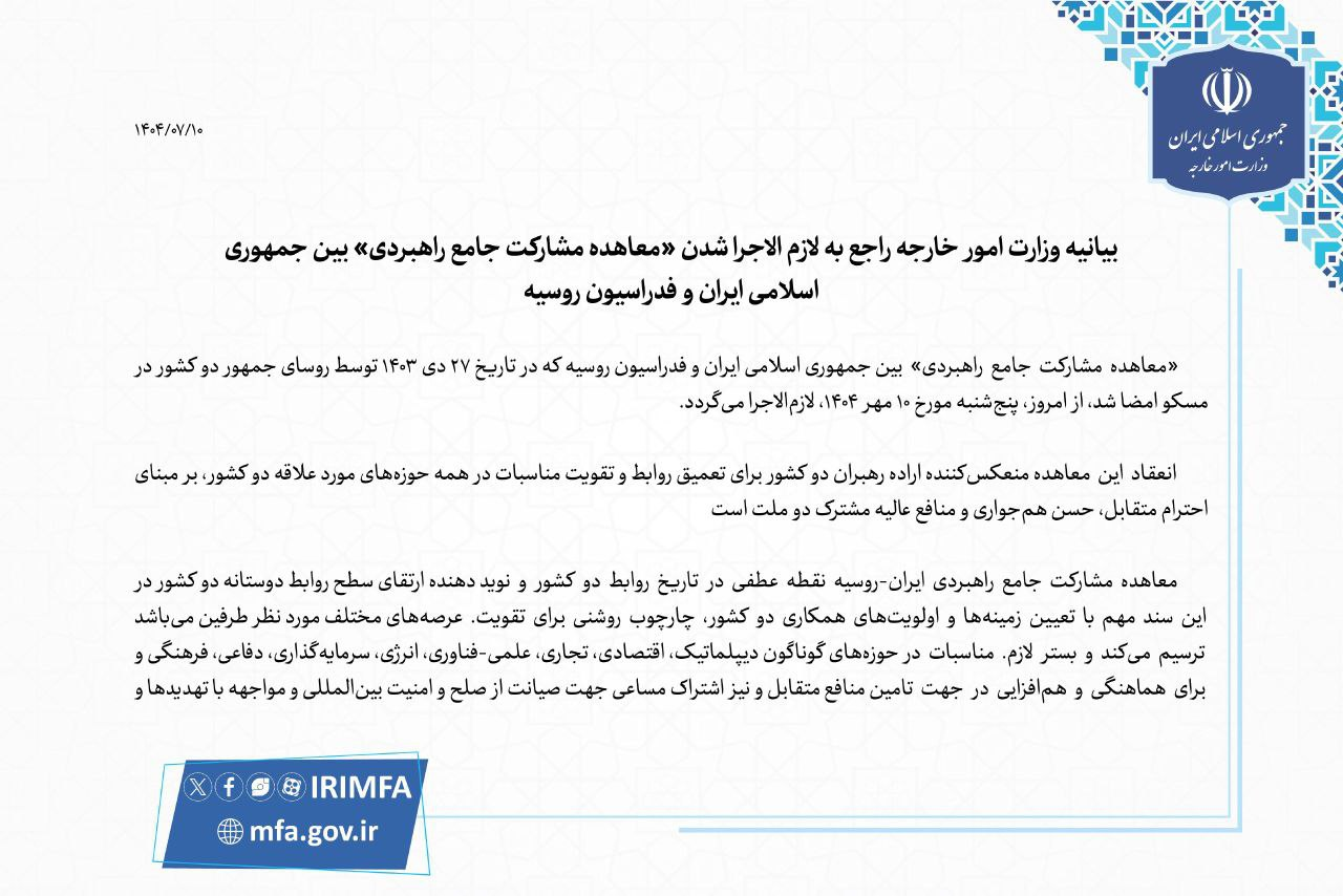 The Comprehensive Strategic Partnership Treaty between the Islamic Republic of Iran and the Russian Federation signed in Moscow on January 16 2025 by the presidents of the two countries entered into force on Thursday October 2 2025.