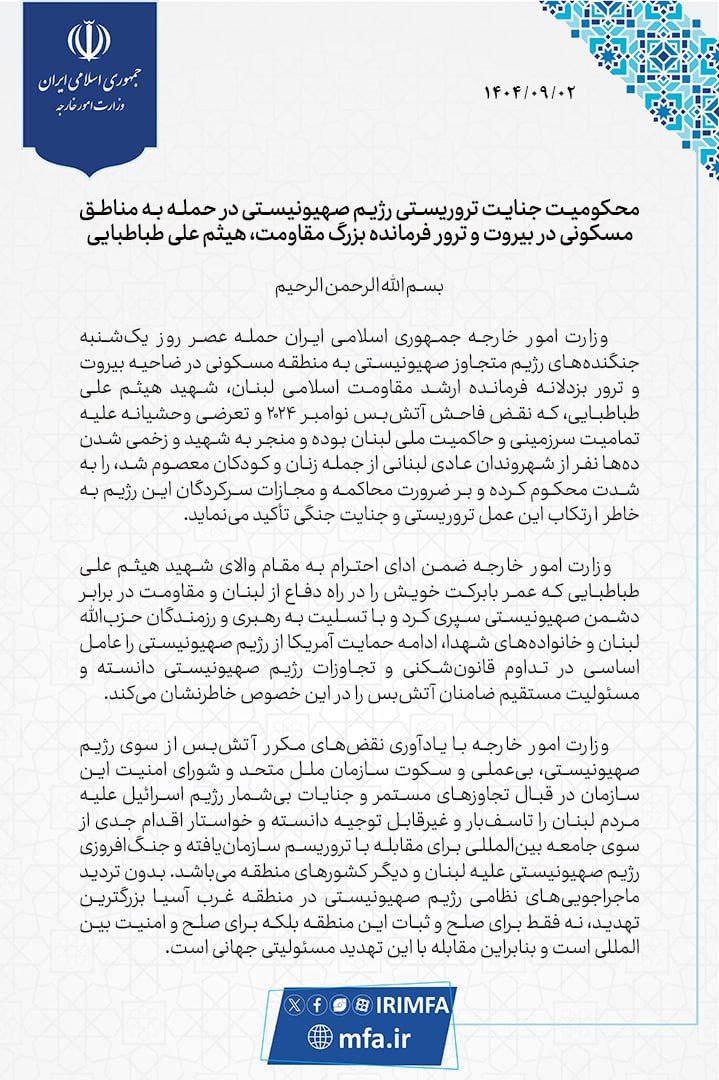 The Foreign Ministry of the Islamic Republic of Iran strongly condemns the Sunday evening attack by warplanes of the aggressor Zionist regime on a residential area in Beirut’s southern suburb and the cowardly assassination of senior commander of the Islamic resistance in Lebanon, martyr Haitham Ali Tabatabaei.