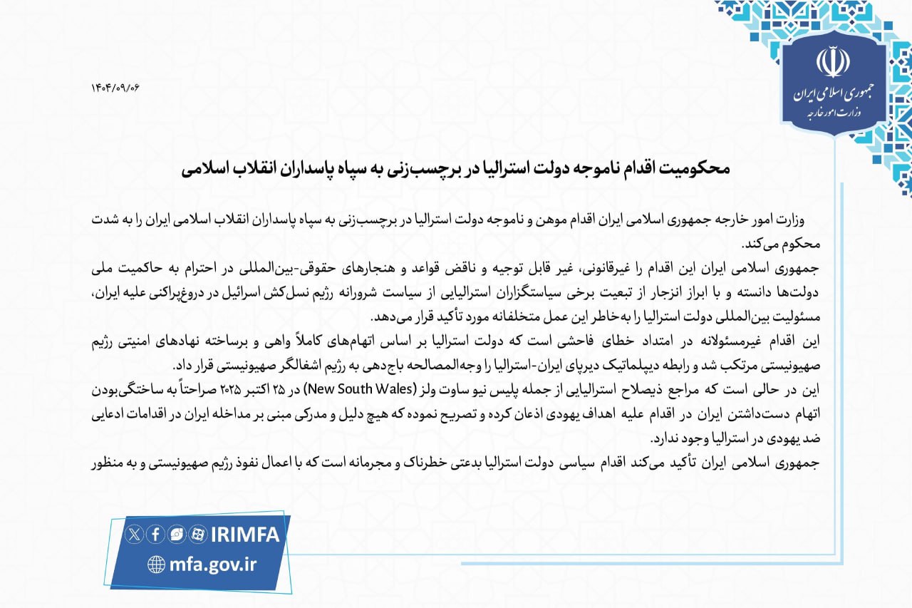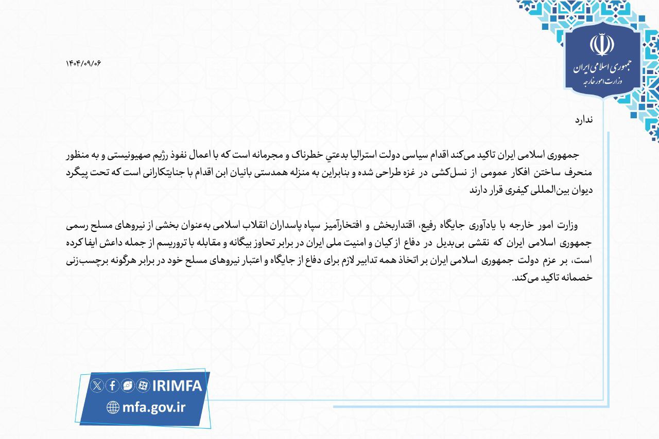 This irresponsible measure is a continuation of the grave error committed by the Australian Government on the basis of wholly baseless accusations fabricated by the security agencies of the Zionist regime, an error that made the longstanding diplomatic relationship between Iran and Australia a bargaining chip in appeasing the Zionist occupying regime. This is notwithstanding the fact that the competent Australian authorities—including the New South Wales Police—explicitly acknowledged on 25 October 2025 the fabricated nature of the allegation of Iran’s involvement in an action against Jewish targets, affirming that no evidence whatsoever exists indicating Iranian involvement in the alleged anti-Jewish acts in Australia.