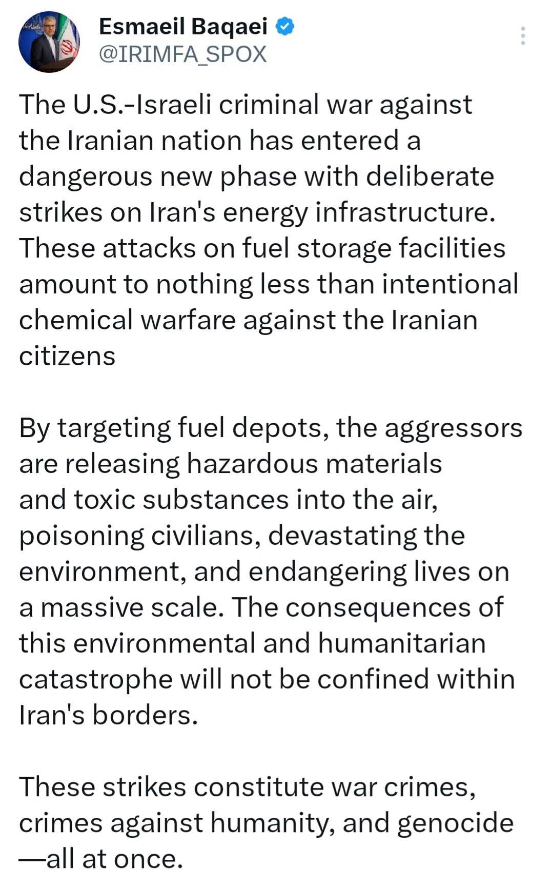The U.S.-Israeli criminal war against the Iranian nation has entered a dangerous new phase with deliberate strikes on Iran's energy infrastructure. These attacks on fuel storage facilities amount to nothing less than intentional chemical warfare against the Iranian citizens