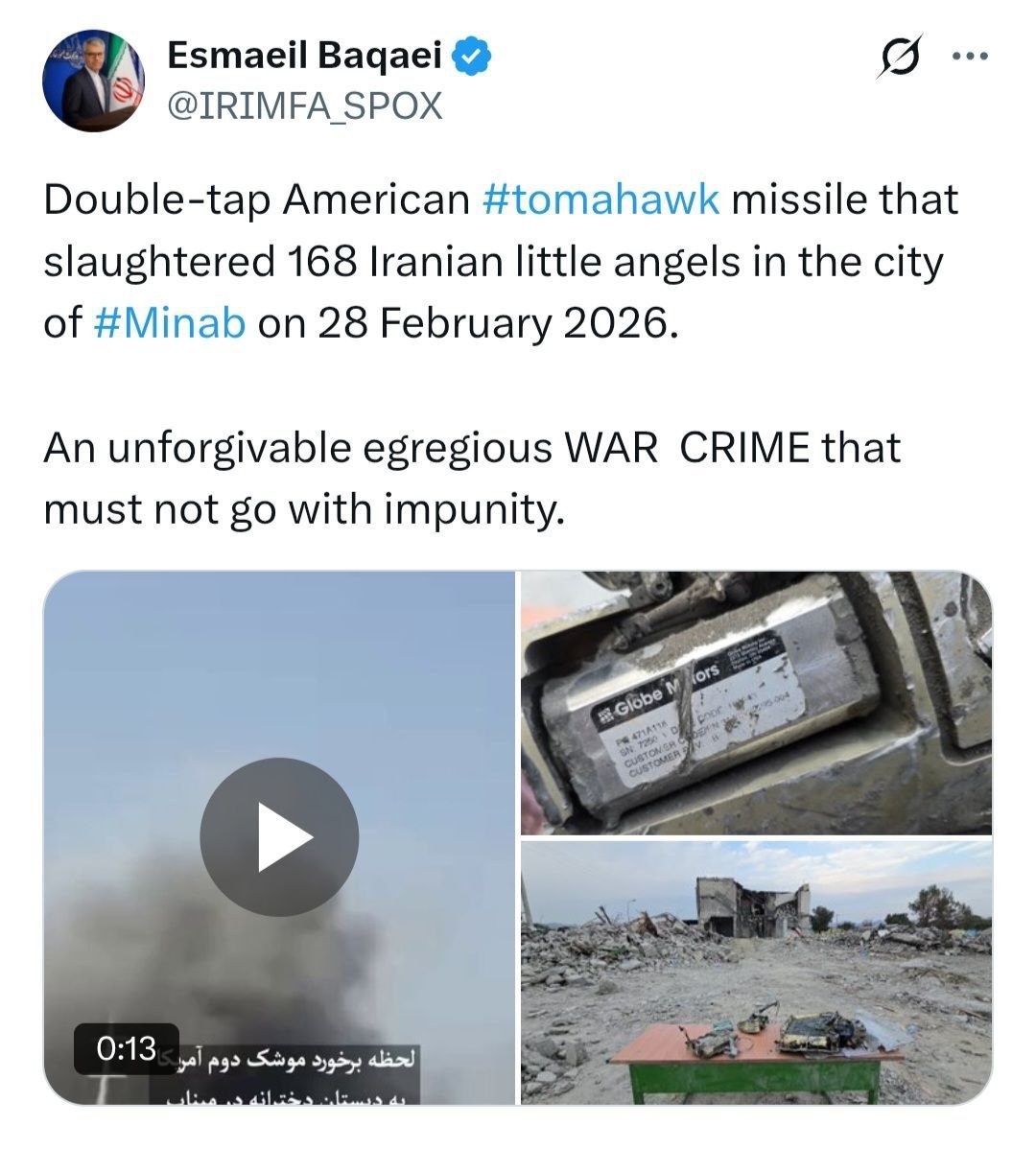 Double-tap American #tomahawk missile that slaughtered 168 Iranian little angels in the city of #Minab on 28 February 2026. An unforgivable egregious WAR CRIME that must not go with impunity.