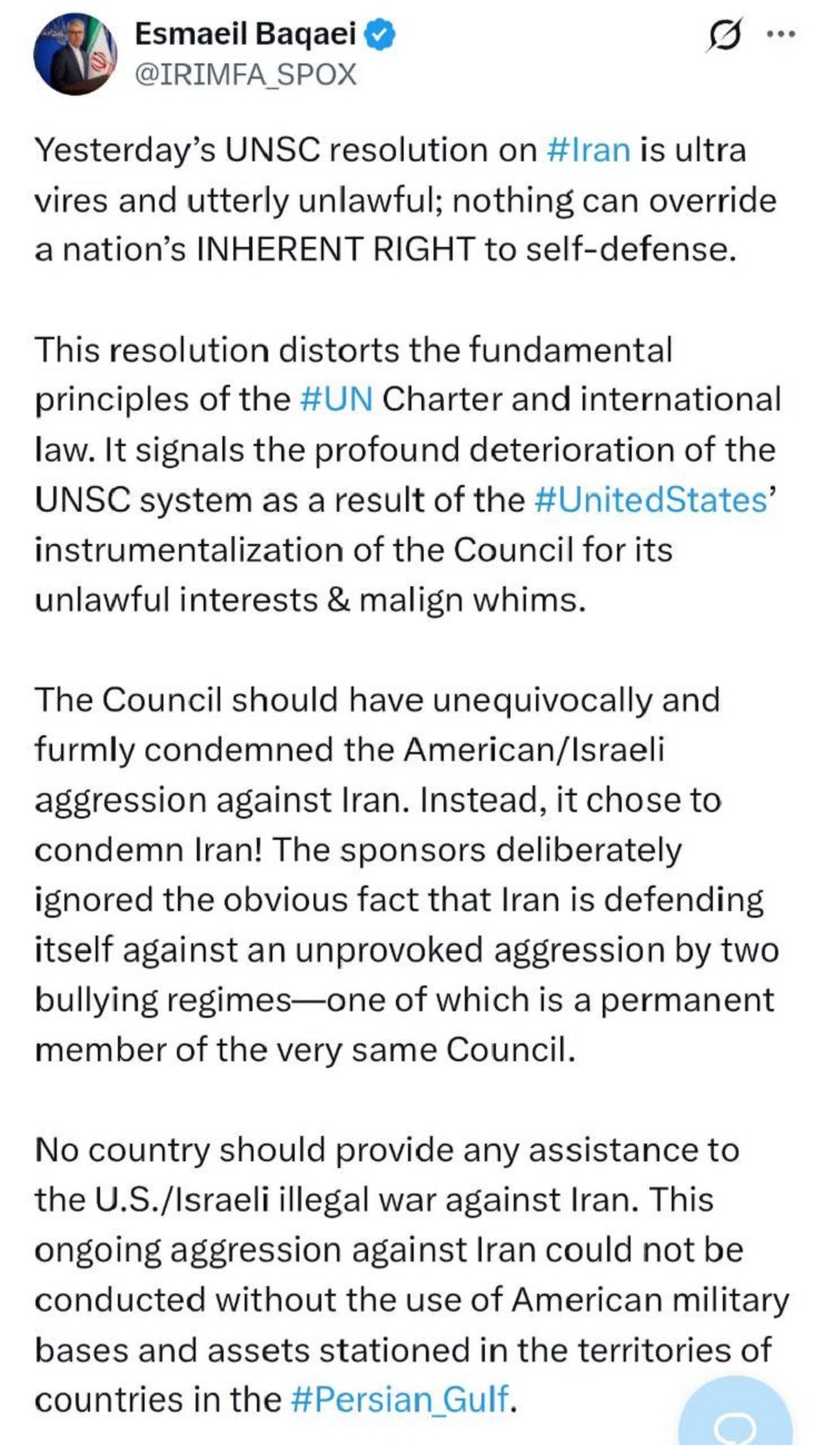 Yesterday’s UNSC resolution on #Iran is ultra vires and utterly unlawful; nothing can override a nation’s INHERENT RIGHT to self-defense. This resolution distorts the fundamental principles of the #UN Charter and international law. It signals the profound deterioration of the UNSC system as a result of the #UnitedStates’ instrumentalization of the Council for its unlawful interests & malign whims. The Council should have unequivocally and furmly condemned the American/Israeli aggression against Iran. Instead, it chose to condemn Iran! The sponsors deliberately ignored the obvious fact that Iran is defending itself against an unprovoked aggression by two bullying regimes—one of which is a permanent member of the very same Council. No country should provide any assistance to the U.S./Israeli illegal war against Iran. This ongoing aggression against Iran could not be conducted without the use of American military bases and assets stationed in the territories of countries in the #Persian_Gulf. Iran has no intention of violating the sovereignty or territorial integrity of its neighbors and has exercised maximum restraint. Our armed forces remain fully committed to international humanitarian law, selecting their targets with the utmost care and caution, and striking only those military bases, installations, and assets used by the aggressors to conduct their illegal war.