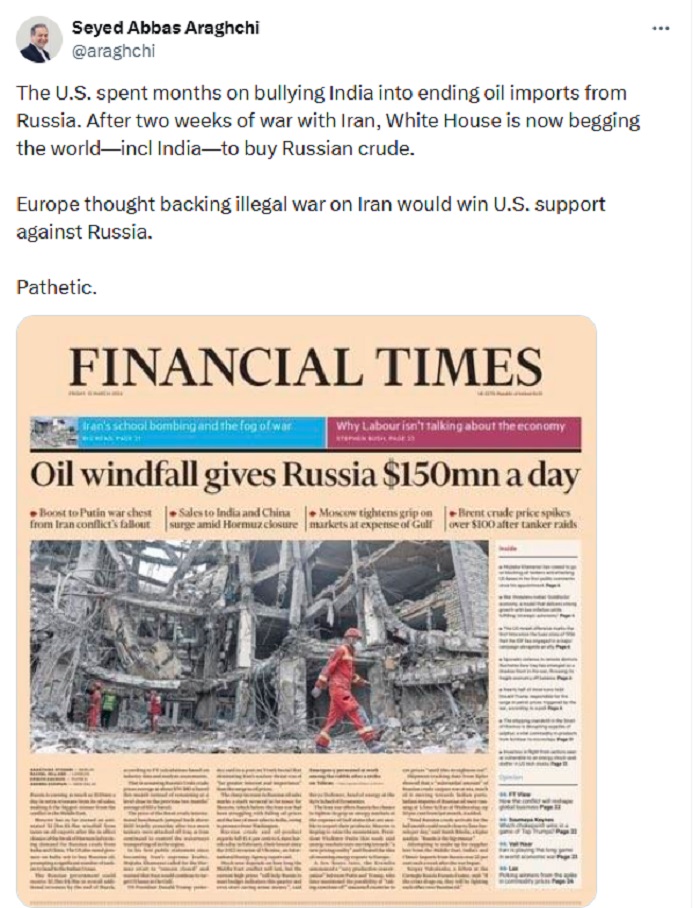 The U.S. spent months on bullying India into ending oil imports from Russia. After two weeks of war with Iran, White House is now begging the world—incl India—to buy Russian crude. Europe thought backing illegal war on Iran would win U.S. support against Russia.