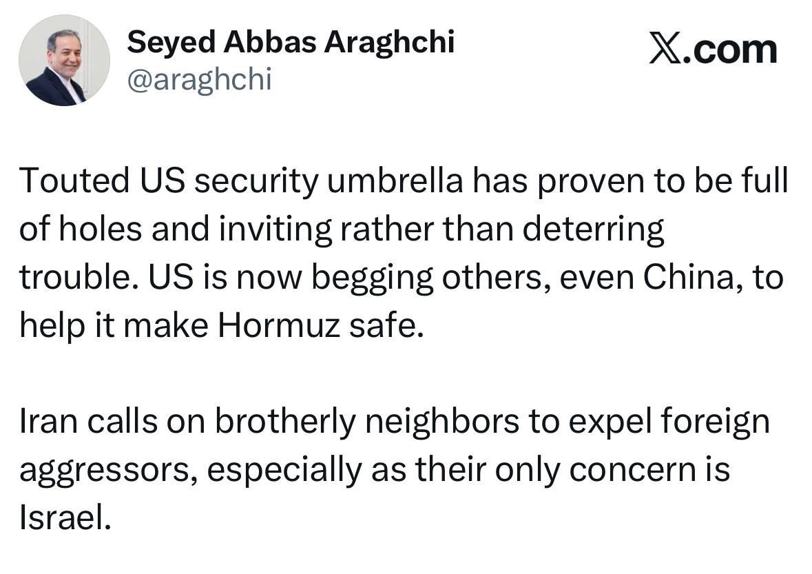 Araghchi: Iran calls on brotherly neighbors to expel foreign aggressors.