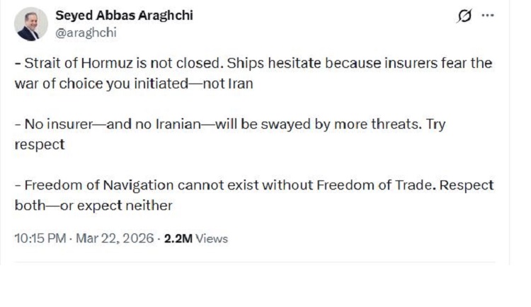 Seyed Abbas Araqchi, our country's Foreign Minister, wrote in a message on the X network regarding the situation in the Strait of Hormuz: